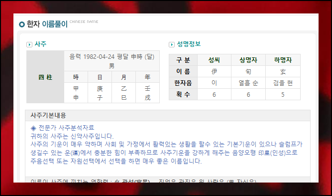 이름 해석 화면에서는 이름에 사용된 한자의 의미, 발음, 획수를 한눈에 볼 수 있어요. 그 다음으로 사주 기본 내용이 표시되는데, 제 경우에는 신약사주에 해당하며 매우 좋은 이름을 가졌다고 평가 받았습니다.