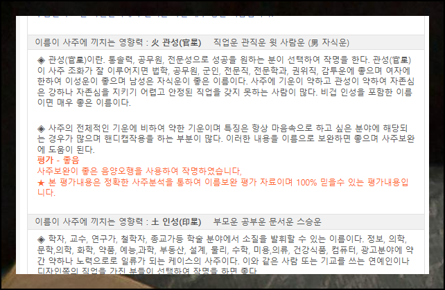 시스템은 이름이 사주에 끼치는 영향력을 첫 번째로 알려줘요. 활동운, 처가운, 직업운, 관직운 등을 파악할 수 있습니다. 시간이 부족하다면 각 항목의 평가 부분만 살펴봐도 좋음/나쁨을 즉시 알 수 있어요.