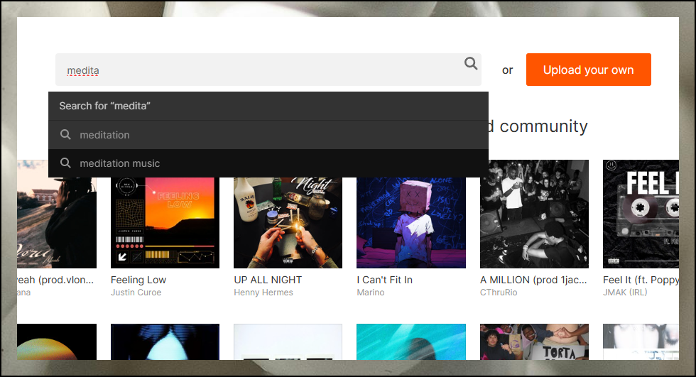 사운드클라우드 닷컴에서는 다양한 장르의 곡들을 무료로 감상할 수 있어요. 국내 인기곡도 많이 있답니다. 오늘은 명상음악에 대한 연속 재생 방법에 집중할게요. 화면 중앙 상단의 검색창에 "meditation music"을 입력하고 엔터키를 눌러주세요. "medita"까지만 타이핑해도 자동완성 기능이 활성화되니 편리하게 활용하세요.