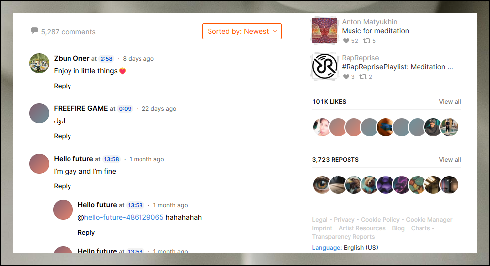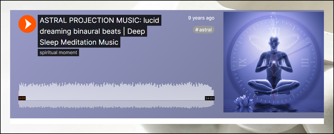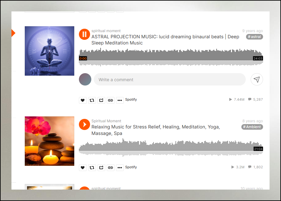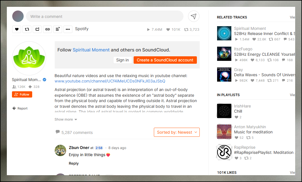 제가 자주 방문하는 오디오 사이트를 소개해드릴게요. 국내에서는 잘 알려지지 않았지만, 어마어마하게 많은 명상음악을 연속으로 들을 수 있는 특별한 공간이에요. 트랙 길이는 짧게는 몇 분에서 길게는 몇 시간까지 다양합니다. 세계 각지에 있는 사람들이 올린 오디오 파일을 통해 편안하게 감상할 수 있어요.