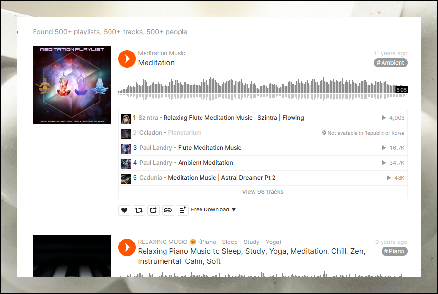 검색 결과로 무료 연속재생 가능한 콘텐츠가 500개 이상 나타납니다. 자연의 소리, 국악, 클래식, 불교음악 등 다양한 종류의 명상 트랙을 찾을 수 있어요. 실제로는 훨씬 더 많은 곡이 존재합니다. 디스플레이 좌측에 있는 [Tracks] 메뉴를 선택해 콘텐츠 위주로 정렬해보세요.