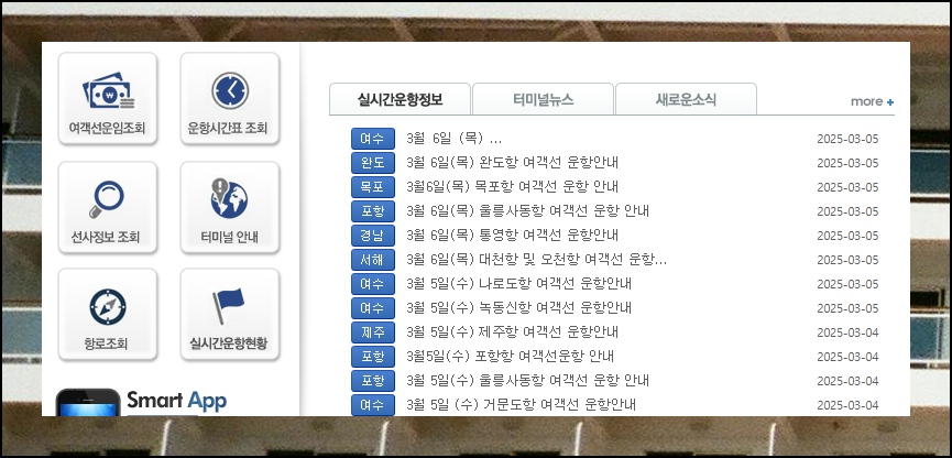 배 운항은 날씨나 계절에 따라 변동될 수 있으니 [터미널 뉴스] 메뉴를 클릭해보세요. 그럼 게시판이 하나 나타나는데요. 여기에서 여수 지역을 검색해 최근 변경사항을 확인해 보는 것이 좋습니다. 모든 안내를 살펴본 후 '시간표/요금조회' 버튼을 눌러 다음 단계로 넘어가세요.