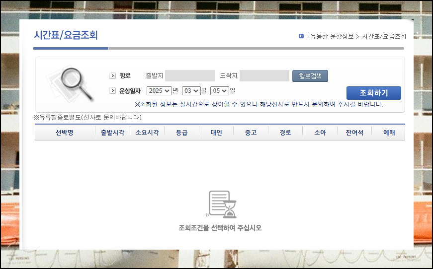 항로검색 버튼을 선택하면 출발지, 도착지, 운항일자를 입력하여 여객선터미널의 모든 운항 정보를 검색할 수 있습니다. 이 기능으로 다양한 배편의 상세 내용을 비교해볼 수 있어요.