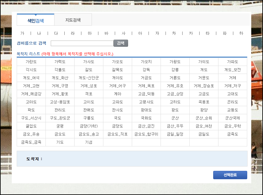 여수항으로 도착하는 배편을 찾으려면 도착지를 '여수'로 지정하세요. 여러 지역에서 이곳으로 향하는 여객선 데이터가 나타납니다. 설정을 마치셨다면 완료 버튼을 눌러 조회를 계속 진행합니다.