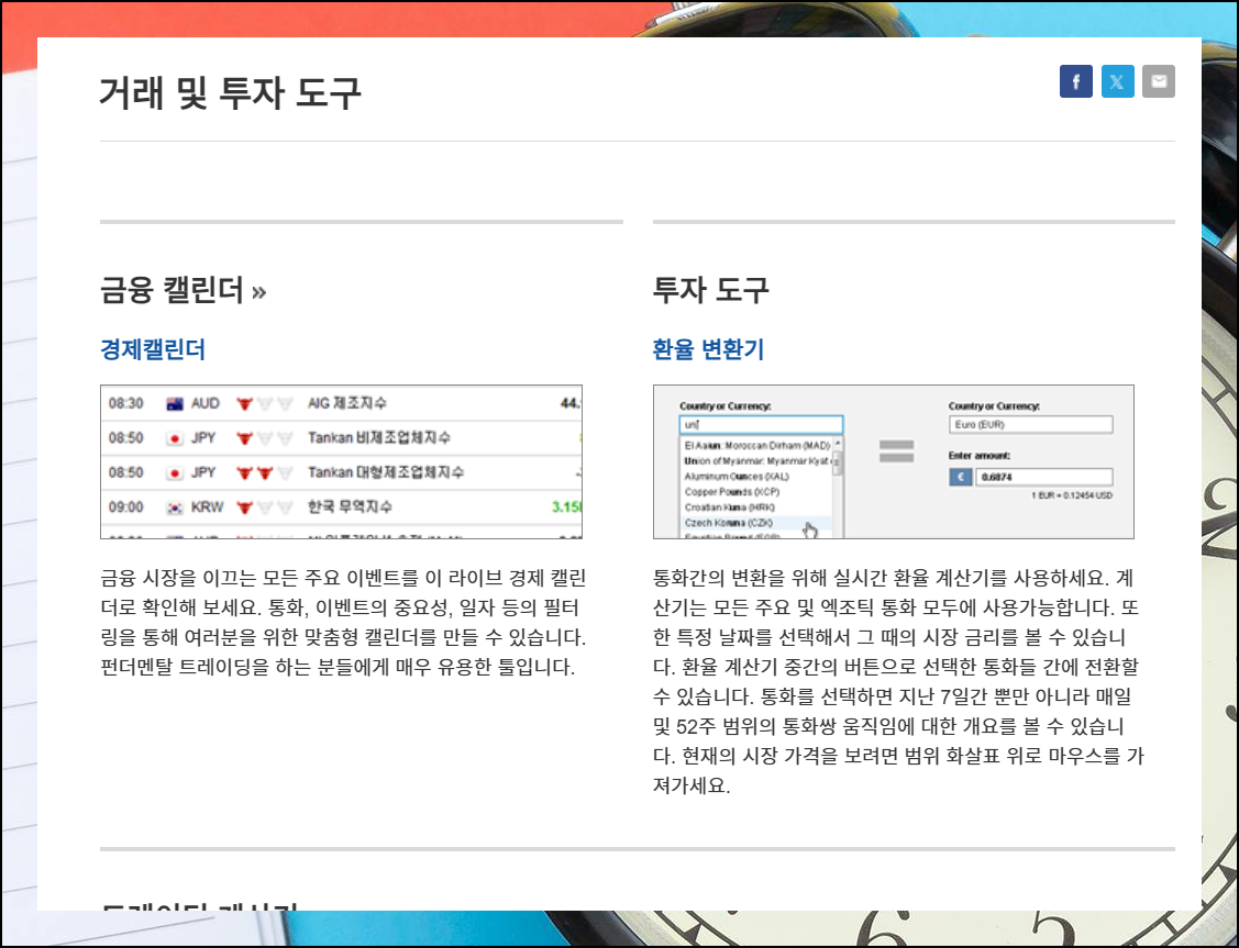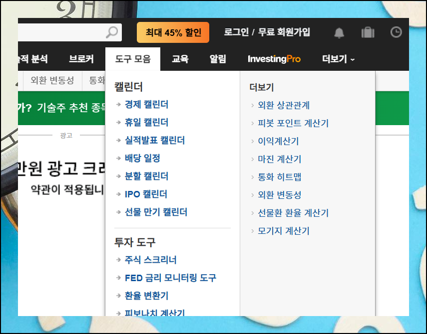 인베스팅 홈페이지 메인화면에서 "도구 모음" 메뉴를 클릭하세요. 이곳에서 주식장 운영시간을 비롯한 다양한 투자 자료를 확인할 수 있습니다. 처음 사용하는 분들도 쉽게 탐색할 수 있게 구성되어 있어요. 직관적인 인터페이스로 필요한 정보에 빠르게 접근이 가능합니다.
