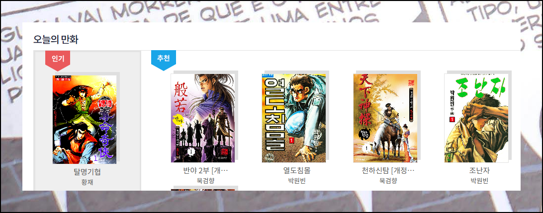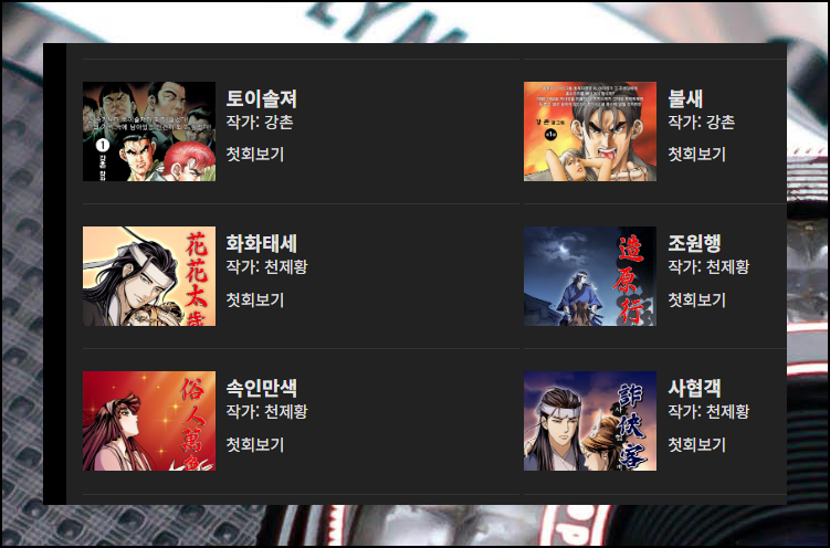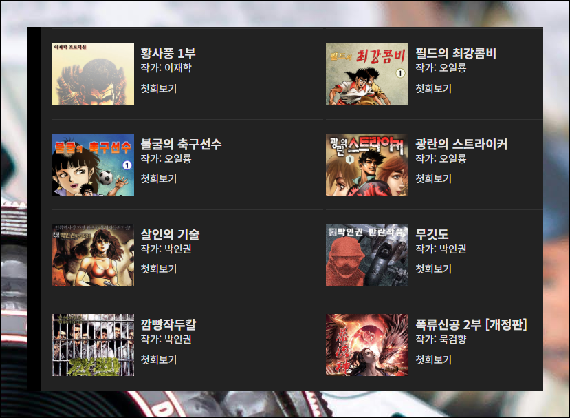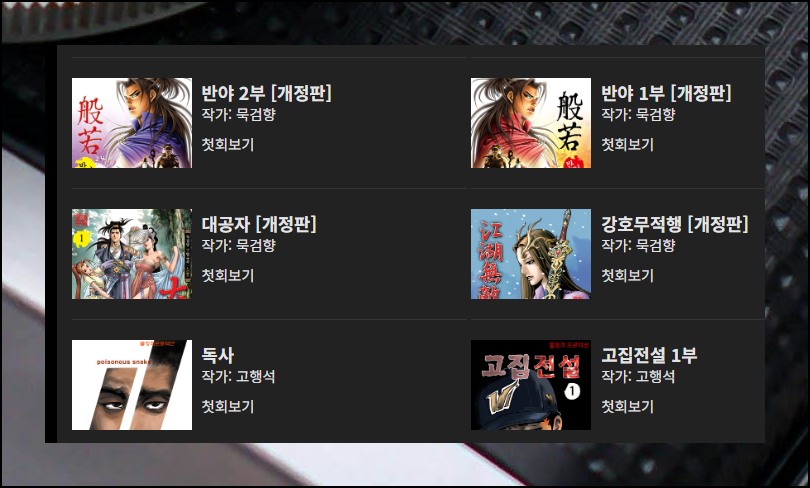 작가 이름을 보면 아시겠지만, 유명 작가의 만화들이 많이 있습니다. 반야, 대공자, 강호무적행, 독사, 고집전설, 토이솔져, 불새, 화화태세 등 눈길을 끄는 것이 많이 보이네요.