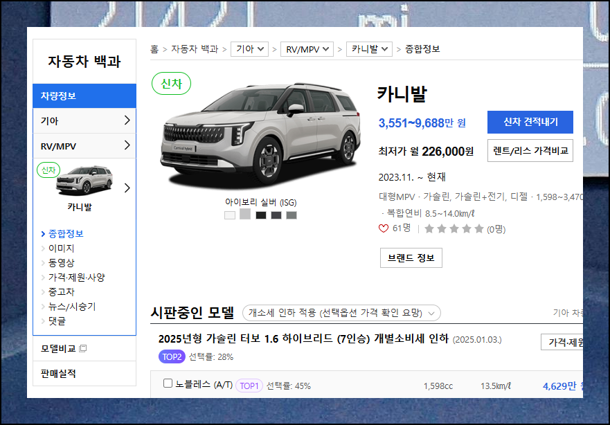 사이트 상단 검색창에 "카니발"을 입력하면 필요한 정보를 신속하게 찾을 수 있어요.
