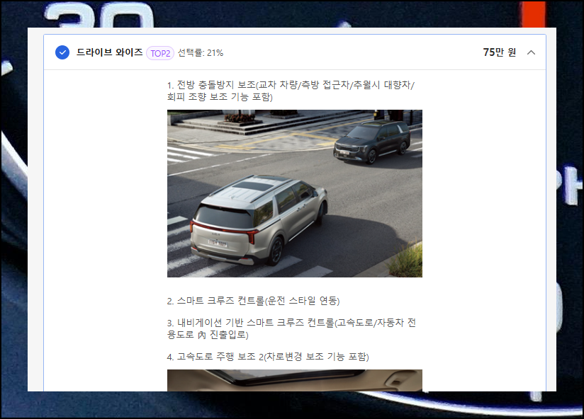 안전, 편의, 엔터테인먼트 등 항목별로 정리된 신차 옵션들을 검토하며 원하는 기능을 쉽게 발견할 수 있어요.