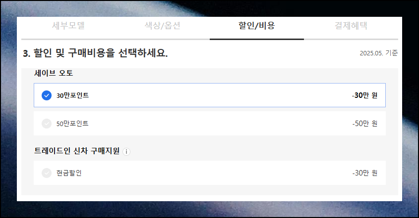제조사 프로모션, 지자체 지원금, 특별 할인 등 다양한 혜택이 있으니 철저히 확인하세요. 선택한 혜택만큼 최종 금액에서 차감됩니다.