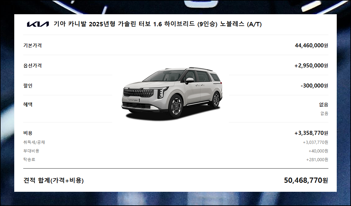 카니발 모델은 색상 변경에 추가 비용이 없지만, 옵션 추가 시 금액이 상승합니다. 취향과 필요에 맞는 디자인과 기능을 선정해보세요.