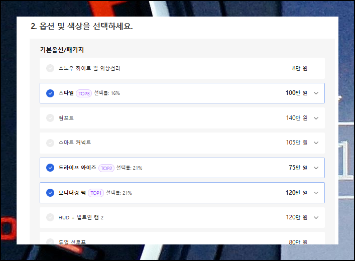원하는 조건을 선택하면 자동으로 비용이 산출되어 바로 파악 가능합니다. 예산 범위 내에서 최적의 사양을 고르기 위해 신차에 대한 옵션별 금액 차이를 살펴보는 것이 좋아요.