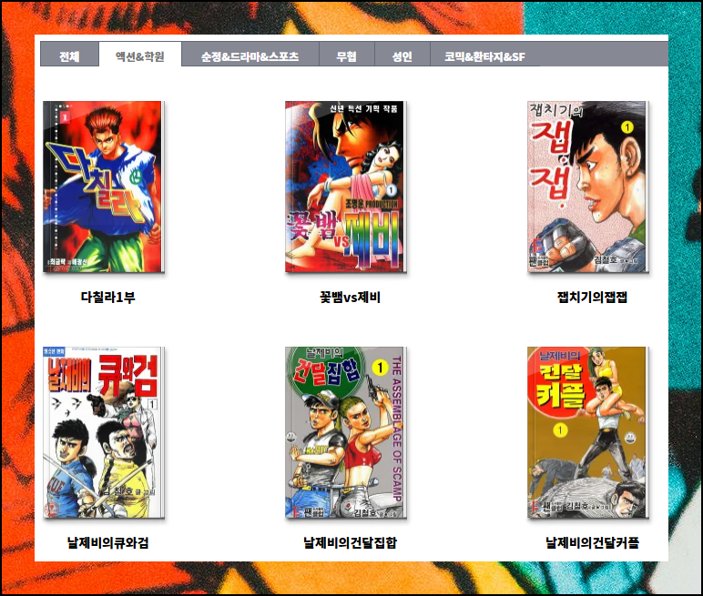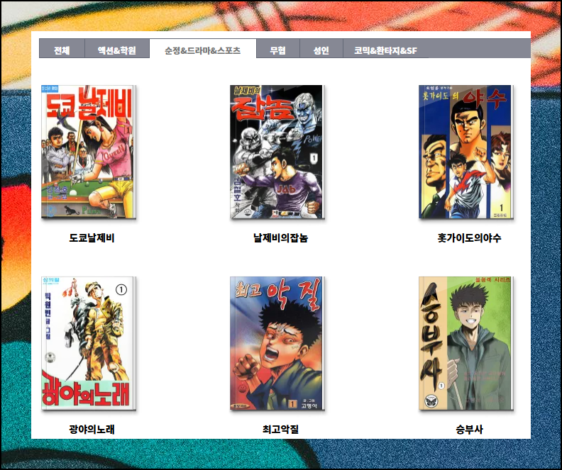 순정, 드라마, 스포츠 장르에서는 장태관, 오일룡, 고행석, 조명운 작가님의 만화들을 열람할 수 있어요.
