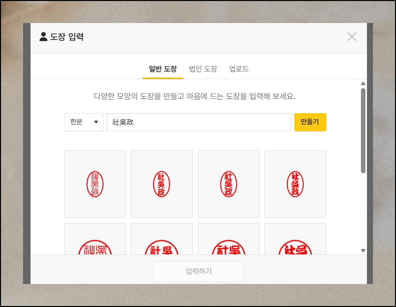 실물 인감 없이 직인 파일을 생성하는 것도 무료로 진행할 수 있는데요. 입력하는 공간에 한글이나 한문으로 이름 또는 회사명만 입력하면 됩니다.