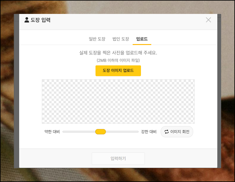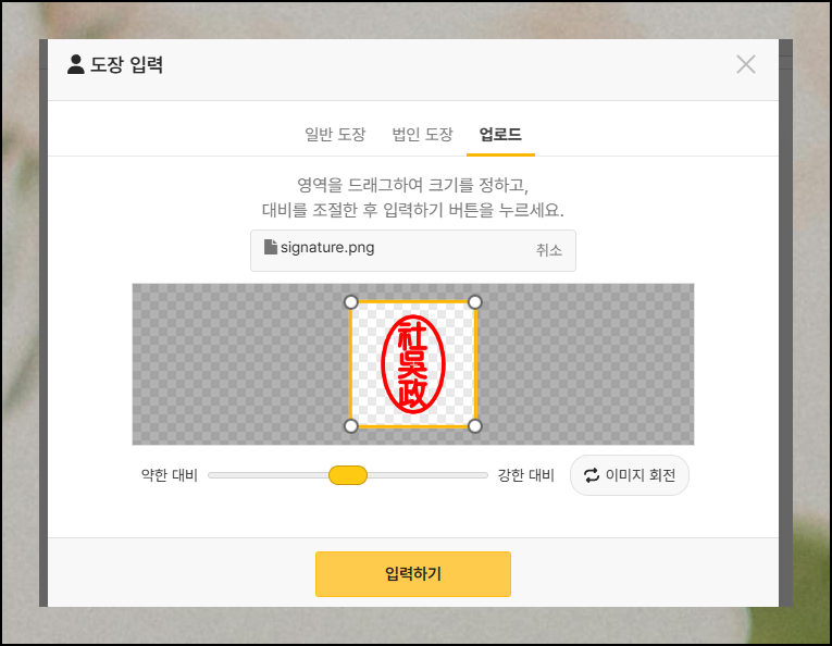 그렇게 하는 것보다 이번에 사용할 서비스를 통해 간단히 해결할 수 있습니다. 스캔한 이미지를 업로드 하고, 대비와 회전만 조절하면 3초 만에 투명 배경의 직인 이미지 파일이 완성돼요.