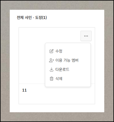 제작한 직인 이미지 파일을 컴퓨터에 저장하면 필요할 때 바로 사용이 가능합니다. 관리 페이지에서 생성한 도장을 확인한 후, 우측 상단의 "점 3개" 메뉴를 클릭하면 다운로드 옵션이 보입니다.