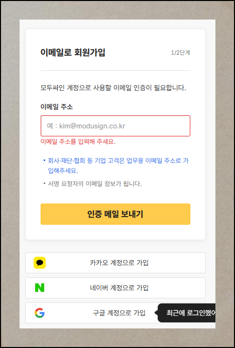 이곳의 직인 만들기 서비스를 이용하려면 로그인을 해야 하는데요. 간편 계정을 활용하면 3초 만에 계정 생성을 할 수 있습니다. 이메일을 통한 일반 회원가입도 간단하기 때문에 어떤 방식을 사용하든 좋아요.