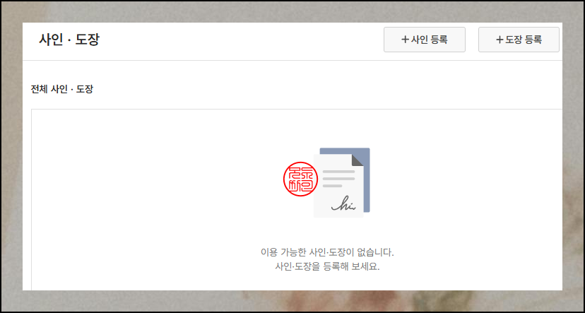 그 다음 우측 상단의 [도장 등록] 버튼을 누르면 만들기 프로그램이 나타납니다. 도장뿐만 아니라 사인 생성 서비스도 무료 제작이 가능해요.