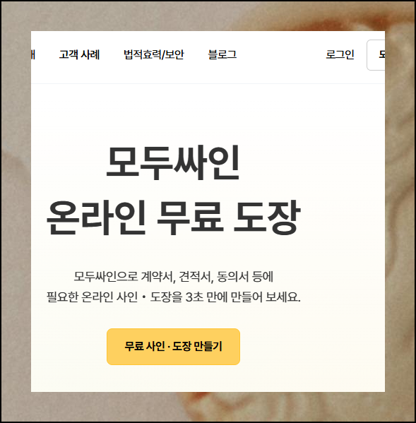 실물 인감을 가지고 있지 않아도 직인 이미지를 만들 수 있는 사이트를 알려드리겠습니다. 바로 "모두싸인" 전자계약 서비스 사이트를 이용하는 것인데요. 이곳에서 제공하는 도장 만들기 프로그램은 누구나 무료로 사용할 수 있습니다.
