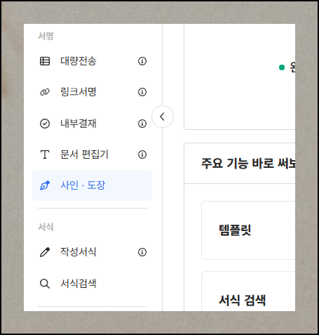 로그인 후 열리는 관리 화면에서는 좌측에 다양한 서비스 메뉴가 표시됩니다. 직인 파일을 제작하려면 [사인 및 도장] 항목을 선택해주세요.