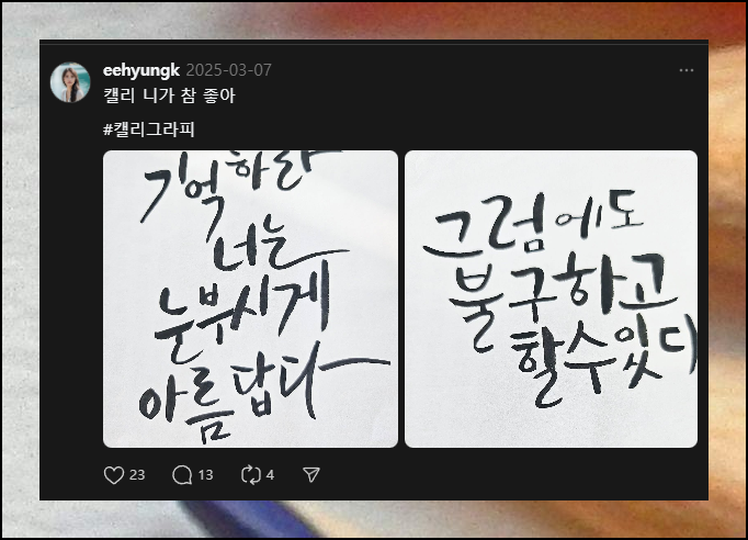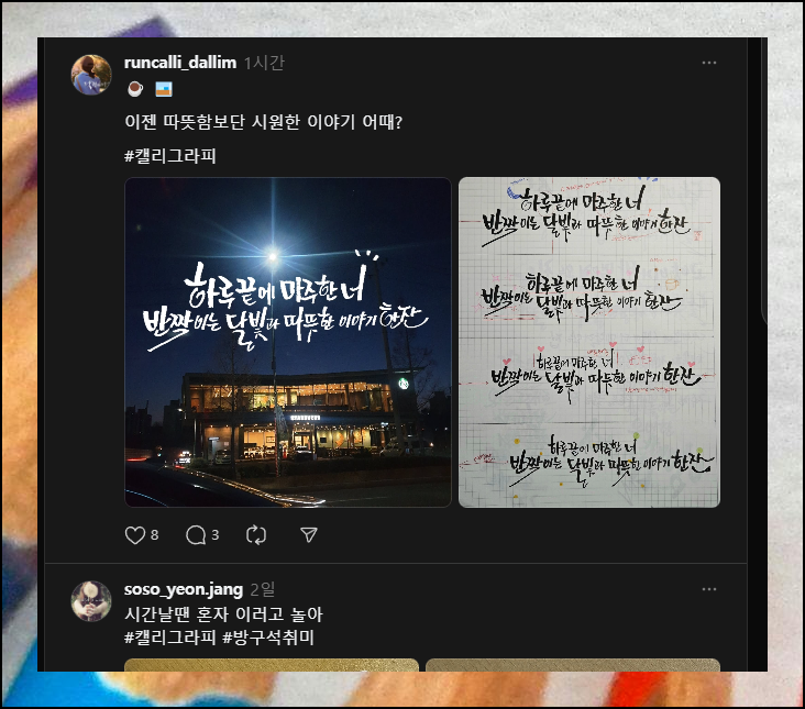 스레드에서는 풍부한 캘리그라피 글귀모음을 손쉽게 찾아볼 수 있습니다. 일반 사이트보다 훨씬 더 많은 양의 자료가 모여 있어서 원하는 디자인 문구를 발견하기 좋아요.