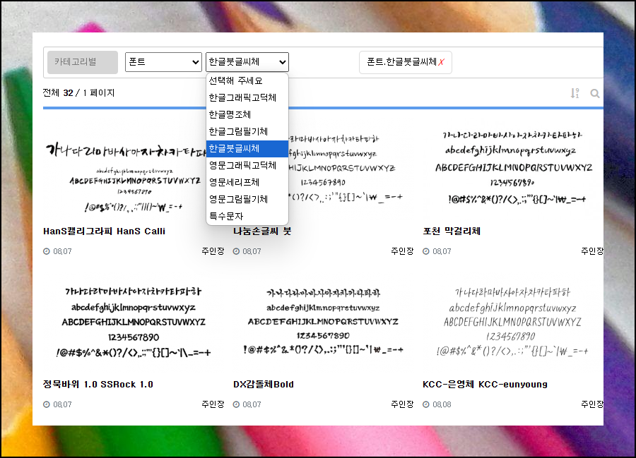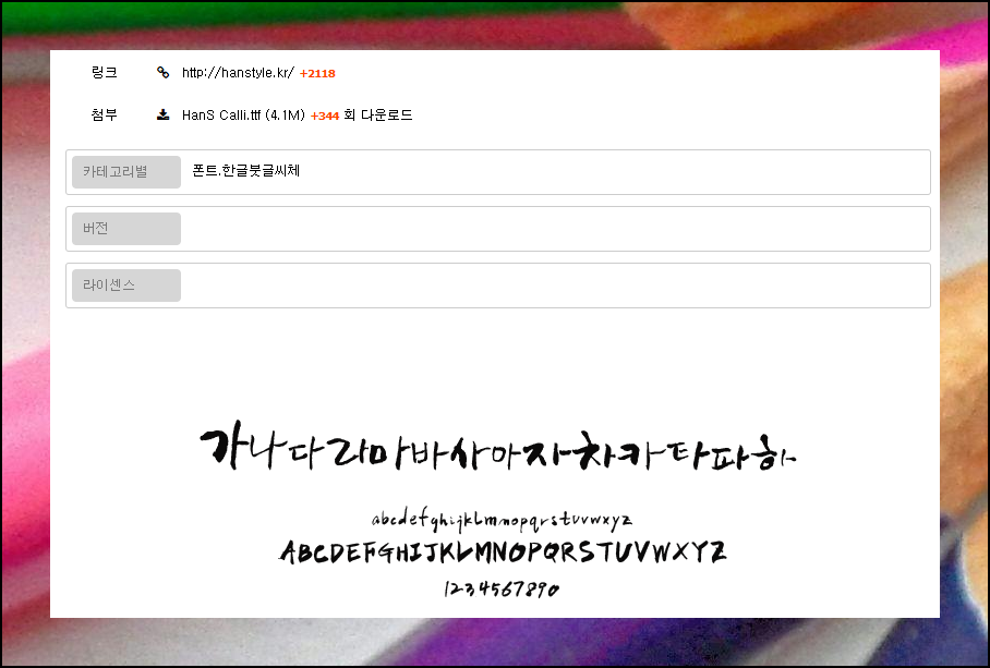 예를 들어, 한글붓글씨체 폰트를 선택해 보았습니다. 많은 사람들이 다운로드 받은 인기 폰트인데요. 누구나 무상으로 이용할 수 있도록 되어 있고, 클릭을 해보면 어떤 스타일로 되어 있는지 미리보기 가능합니다.