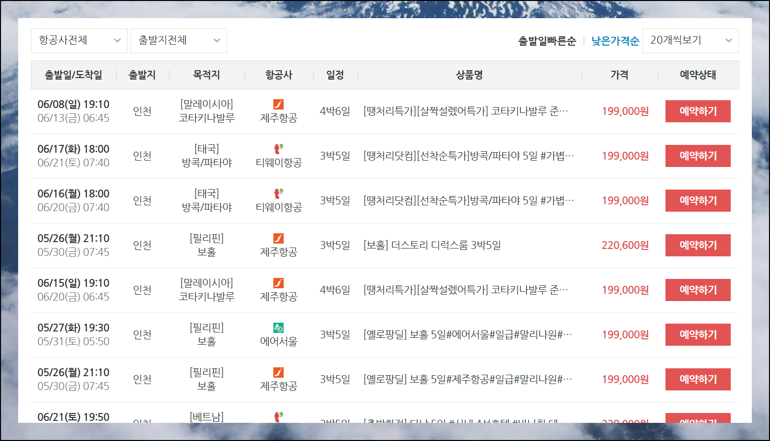 상품 목록에서 최적의 선택을 하려면 단순히 출발일만 보지 마세요. '낮은 가격순' 옵션을 활용해 비용을 꼼꼼히 비교하는 것이 중요합니다. 대부분의 긴급모객과 땡처리 상품은 일주일 이내 출발하는 경우가 많으니 참고하세요.