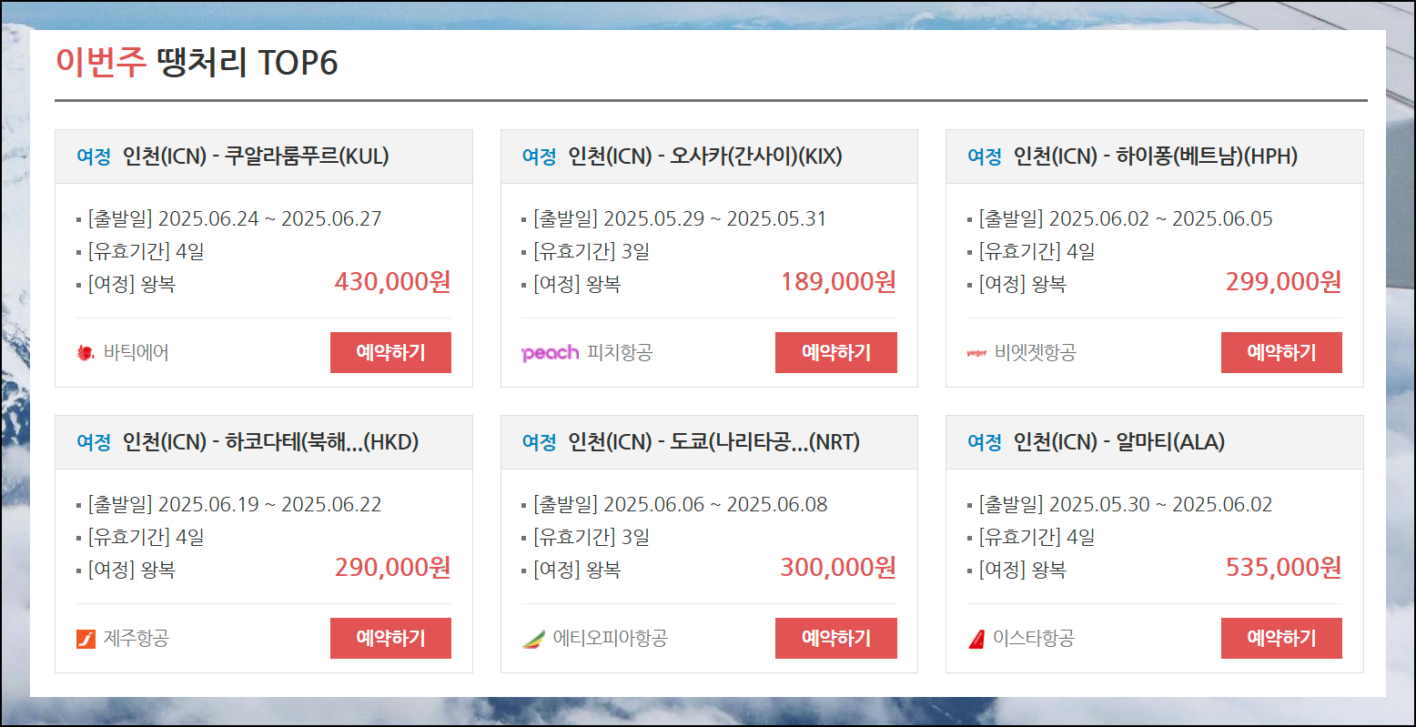 휴가 시즌이 다가오면 해외 수요가 급증해 티켓 가격이 상승합니다. 예약을 미리 하지 못했다면 '이번주 땡처리 TOP6' 섹션을 활용해보세요. 땡처리 중인 항공권은 대체로 경제적인 가격에 제공되어 큰 혜택을 누릴 수 있습니다.