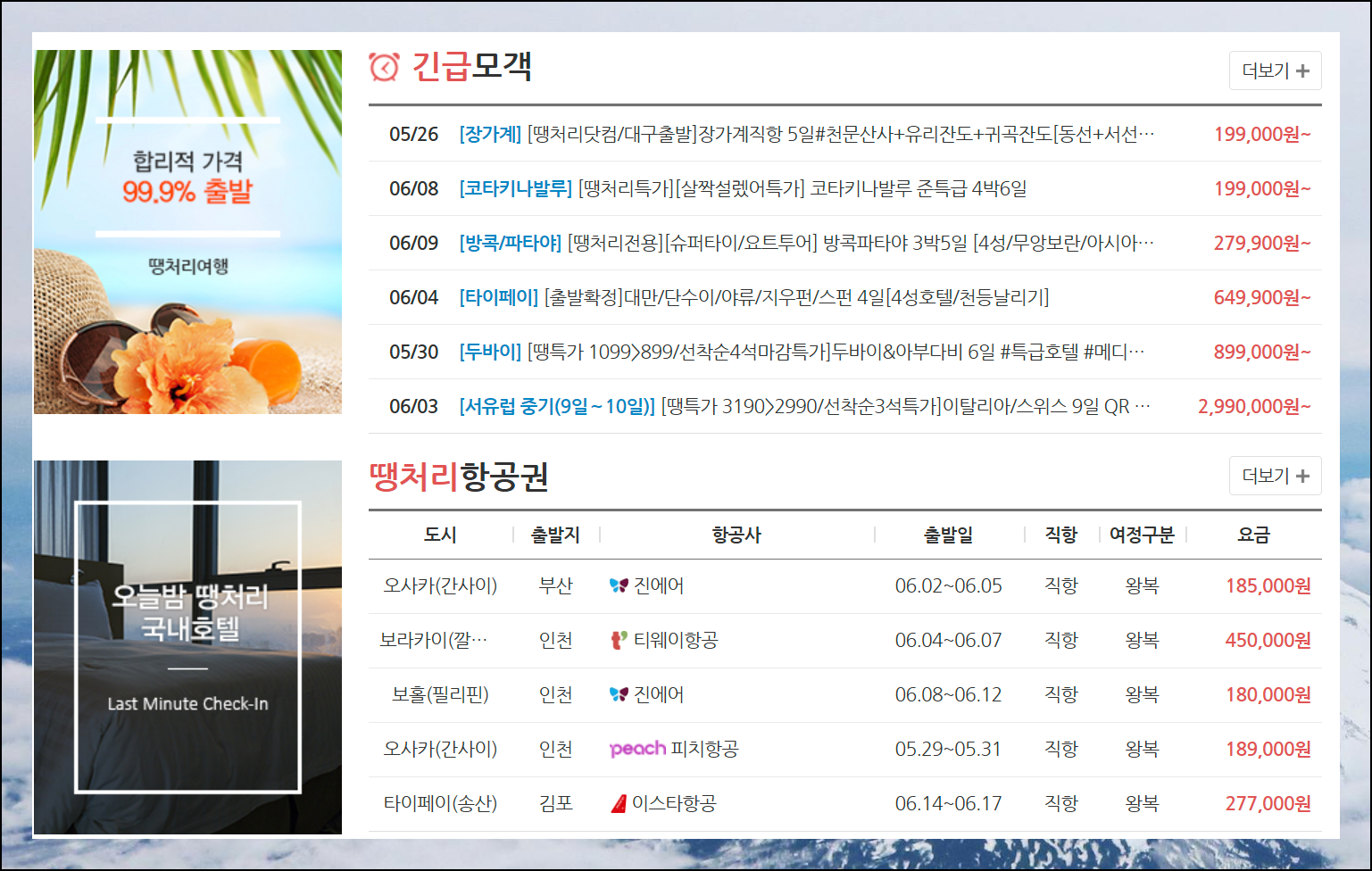 사이트에 방문한 후, 조금만 아래로 스크롤하면 해외여행 긴급모객 리스트를 쉽게 찾을 수 있습니다. 그 아래에는 땡처리 항공권 정보도 함께 표시되어 있어요.