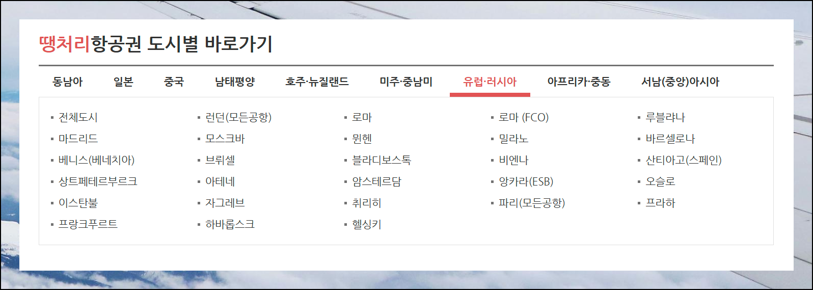 메뉴에서 땡처리 항공권 섹션을 확인하면 출발이 임박한 해외여행 티켓을 매우 저렴하게 구매할 수 있습니다. 도시별로 검색이 가능해 원하는 목적지를 손쉽게 찾을 수 있어요.