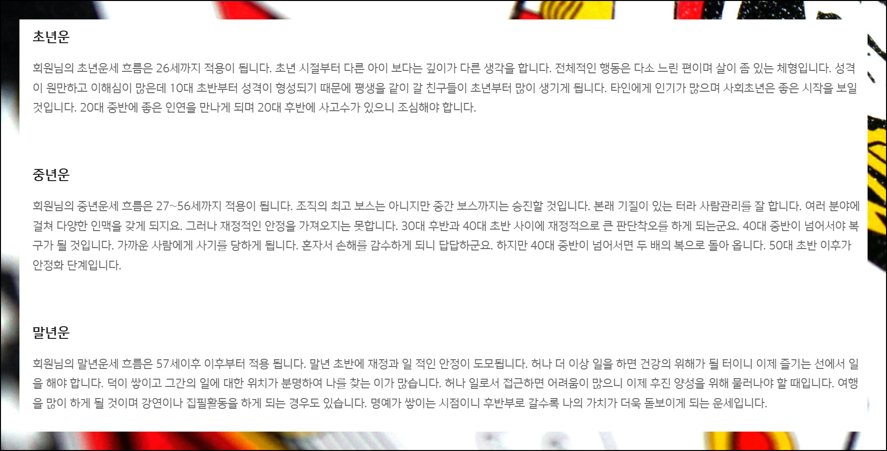 중년운은 27세에서 56세 사이, 말년운은 57세 이후의 운세를 의미해요. 흥미로운 점은 초년, 중년, 말년을 나누는 나이 기준을 사람에 따라 조금씩 차이가 있습니다.
