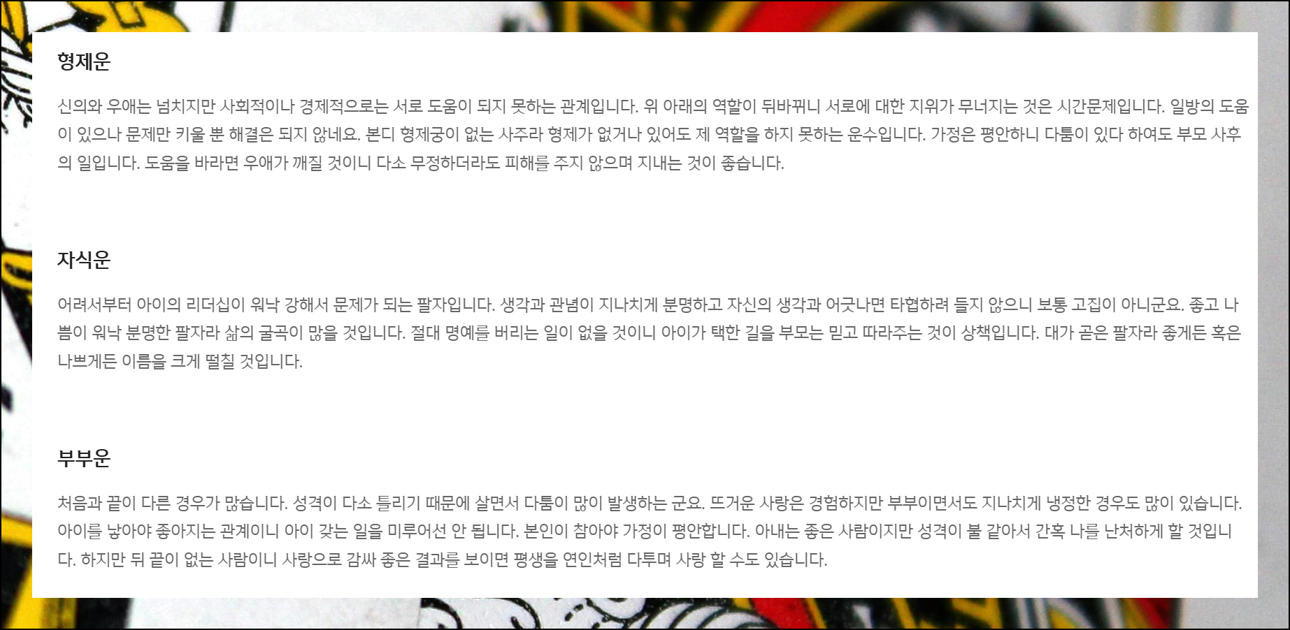 이제 형제, 자식, 부부와 관련된 운세 정보가 등장해요. 가족은 소중한 만큼 나에게 큰 영향을 주는 존재입니다.