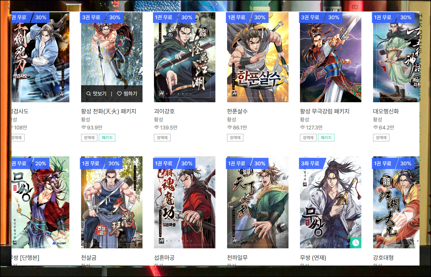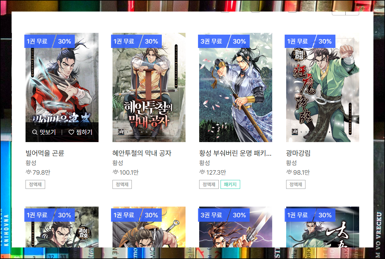 무협만화 코너에서는 황성, 야설록, 사마달 등 인기 작가들의 작품을 발견할 수 있어요. 보시는 바와 같이 많은 작품에 대하여 일부 무료 서비스를 제공하고 있습니다.