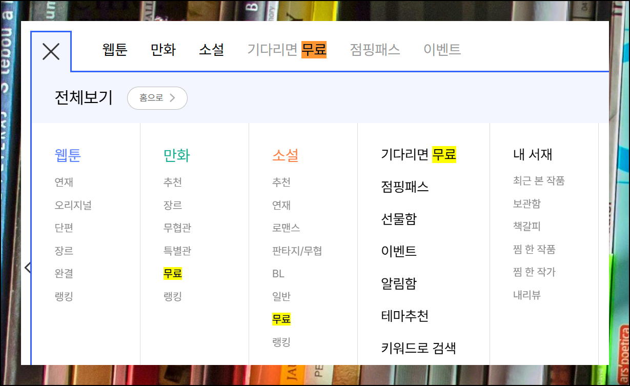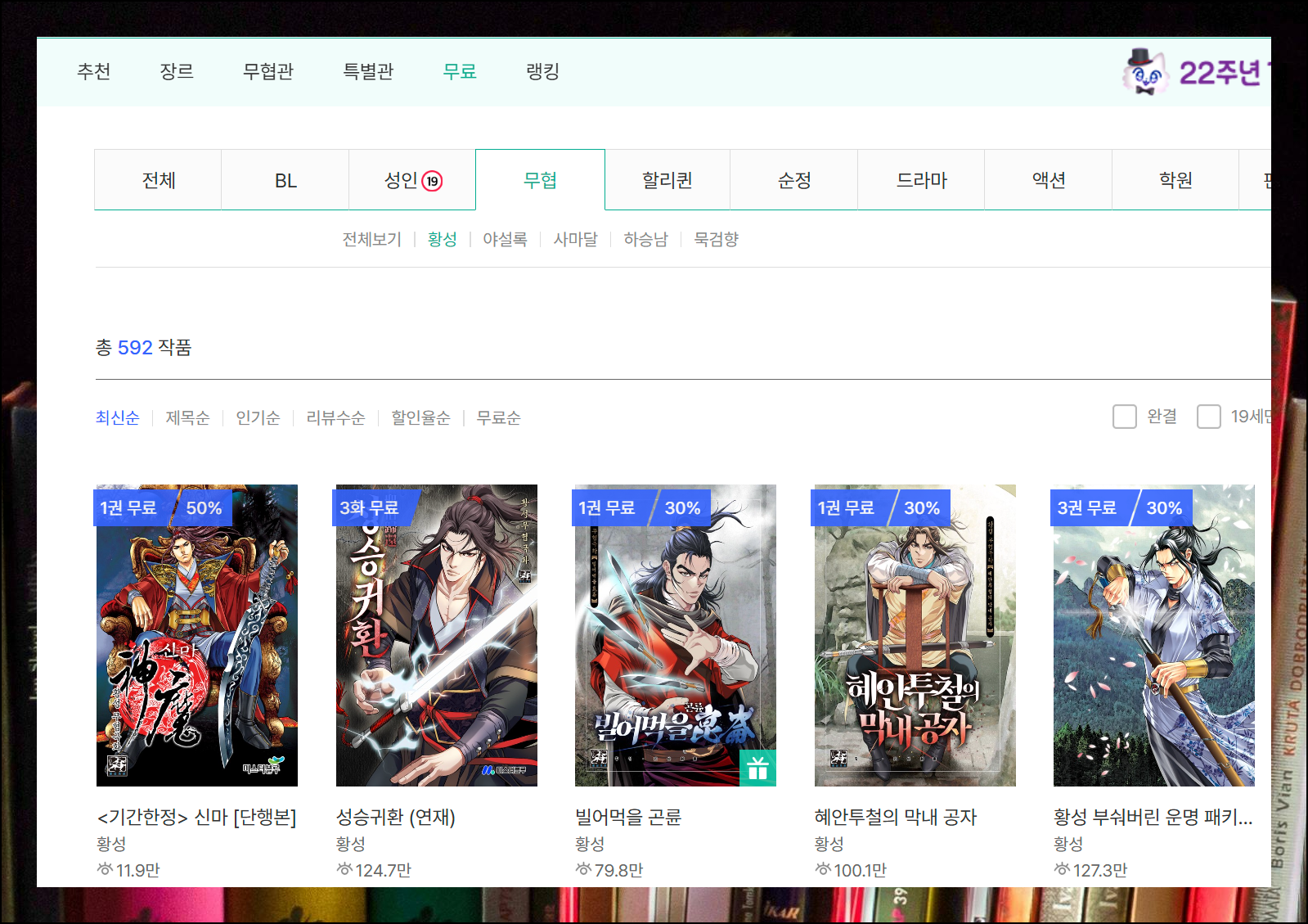 무료 서비스에 진입하면 여러 장르를 선택할 수 있게 되어 있습니다. 황성 작가의 경우에는 "무협" 메뉴를 선택하면 찾을 수 있습니다.