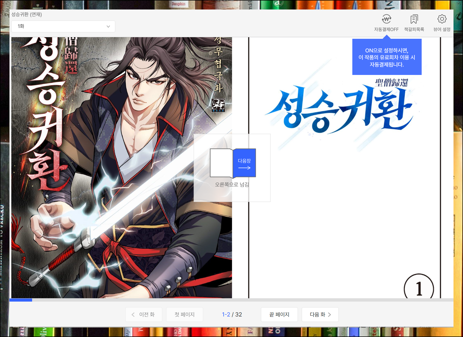 성승귀환이라는 최근 작품을 선택해 보았습니다. 첫 화의 경우 무료로 볼 수 있고, 나머지 부분에 대해서는 할인 이벤트 중이라 저렴한 가격으로 감상할 수 있네요.