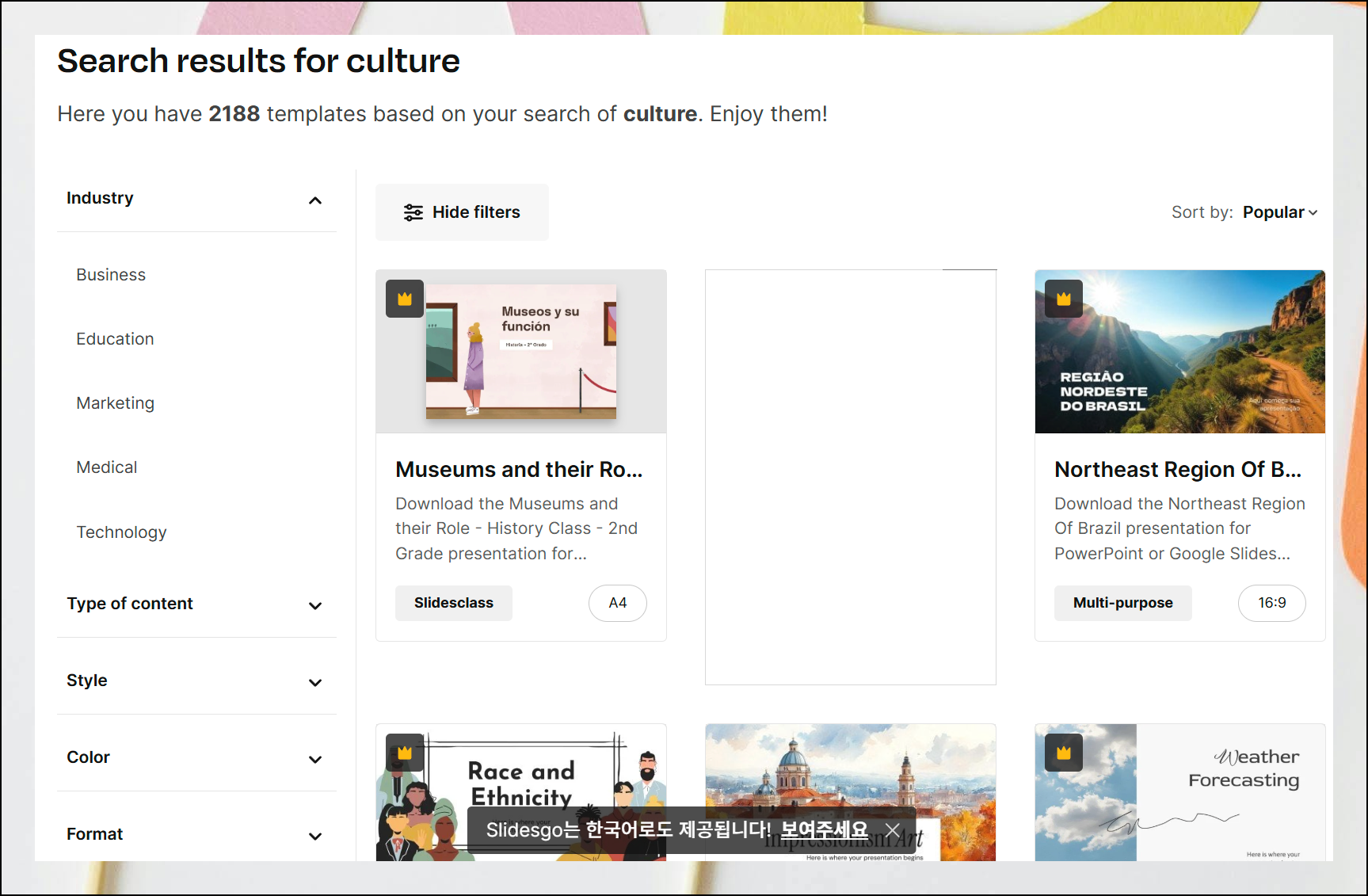 'culture' 키워드로 검색해봤더니 관련 콘텐츠가 2188개나 나왔어요. 이렇게 많은 결과에서 원하는 걸 찾으려면 필터 기능을 써야 합니다. 스타일, 색깔, 제목, 크기 등 여러 조건을 설정해서 딱 맞는 것만 골라낼 수 있어요.