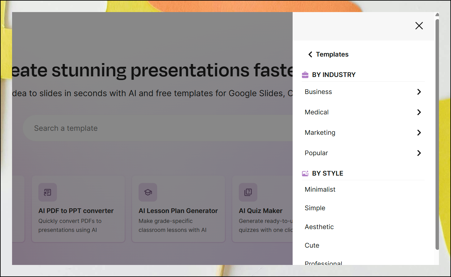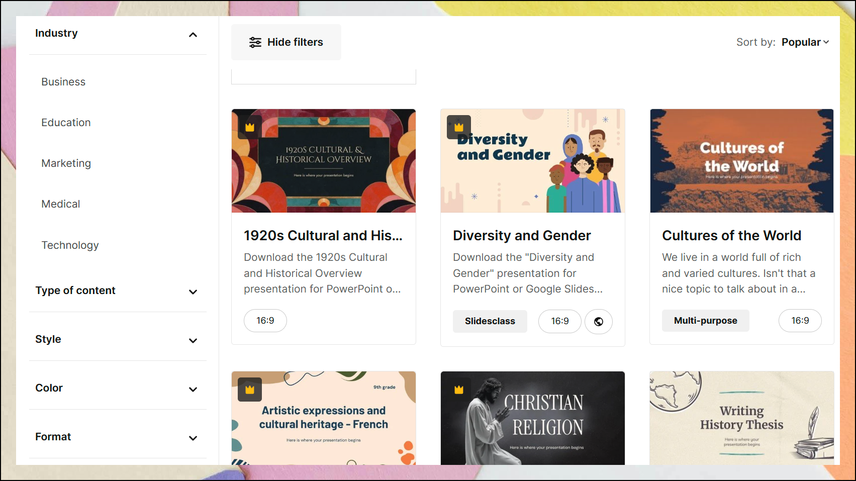 Slidesgo의 가장 큰 장점은 마이크로소프트 파워포인트는 물론이고, 구글에서 쓸 수 있는 Google Slides 콘텐츠도 함께 제공한다는 점이에요. 교육, 비즈니스, 마케팅, 의료 등 정말 다양한 분야별 템플릿이 준비되어 있어요.