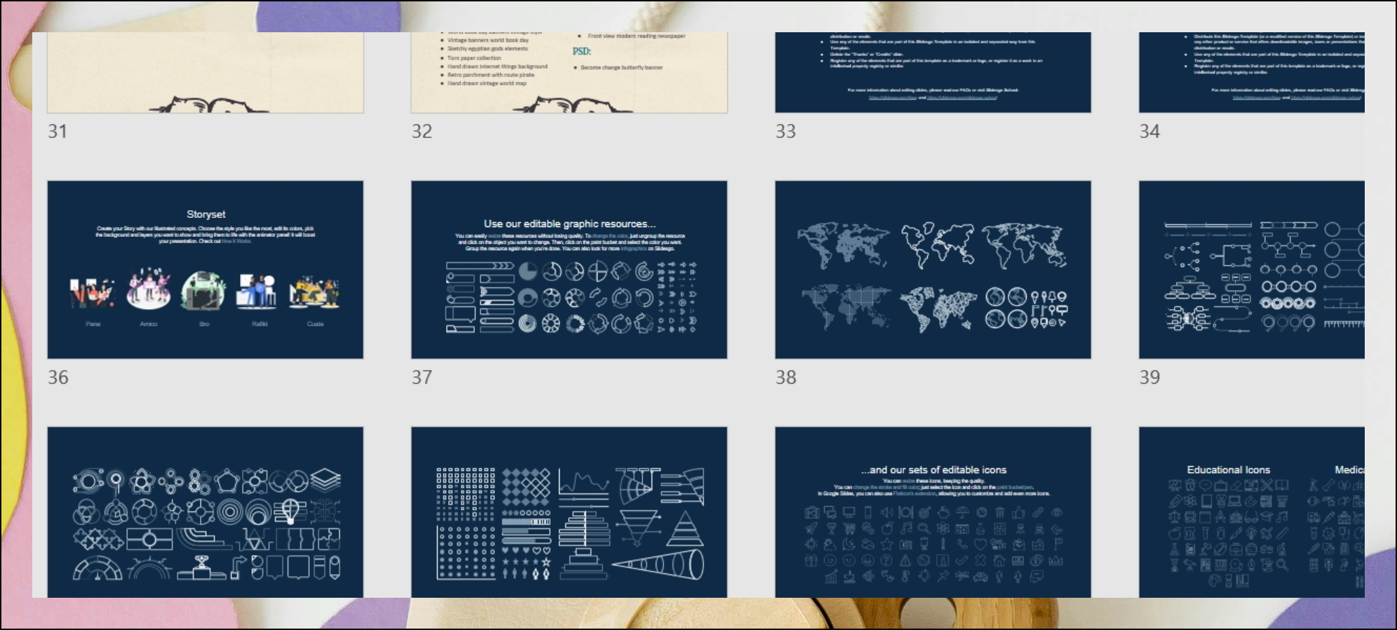 고급스럽고 멋진 느낌의 PPT 템플릿 하나를 선택해봤어요. 총 50개 슬라이드로 구성된 꽤 큰 파일입니다. 무료다운 받기 전에 미리보기 화면에서 어떤 내용으로 구성되어 있는지 자세히 확인할 수 있어요.