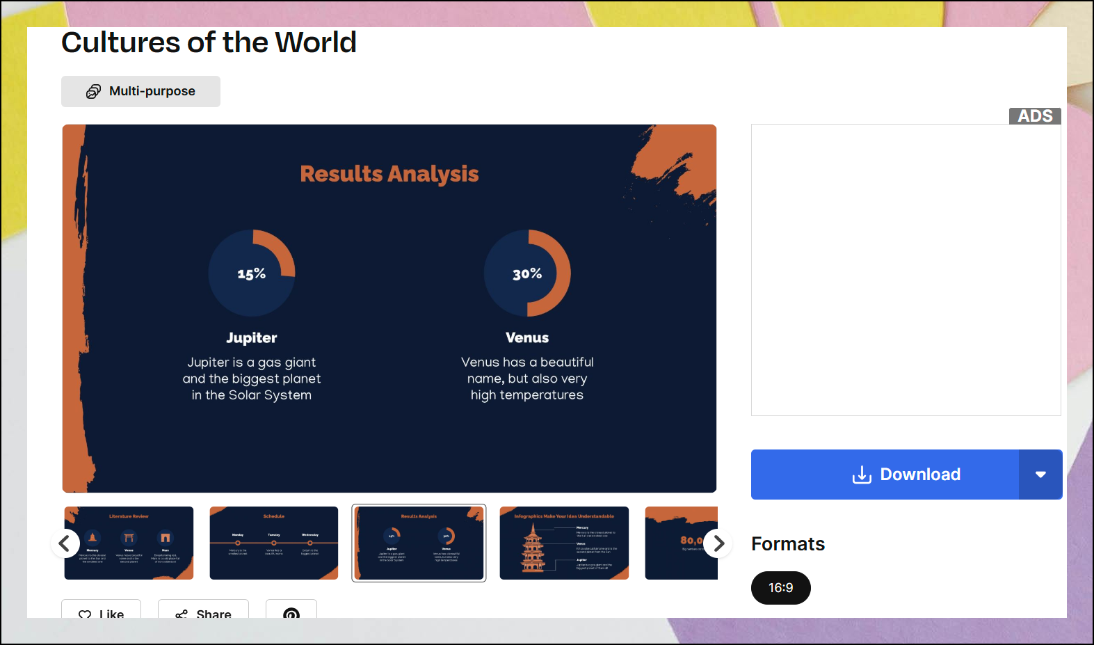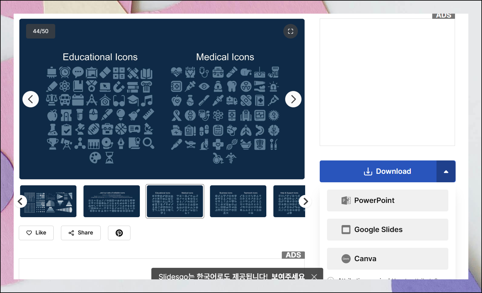 PPT 만들 때 쓸 수 있는 디자인 콘텐츠들이 정말 많이 있어요. 작업하다가 빈 공간이 생겼을 때 이런 아이콘들을 넣어주면 훨씬 전문적으로 보입니다. 플랫폼 오른쪽에는 Google Slides용과 PowerPoint용을 각각 무료다운 받을 수 있는 버튼이 따로 있어요.