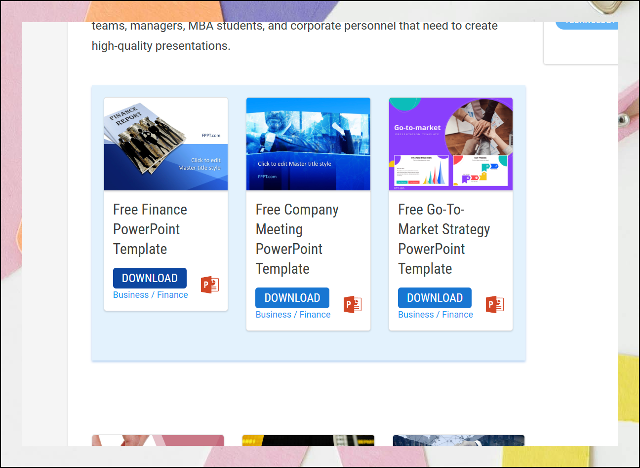 회사에서 쓸 수 있는 비즈니스용 PPT 파일을 골라봤습니다. 미리보기 이미지 옆에 버튼이 바로 보이네요. 버튼을 누르면 별다른 조건 없이 템플릿 파일을 받을 수 있어요.