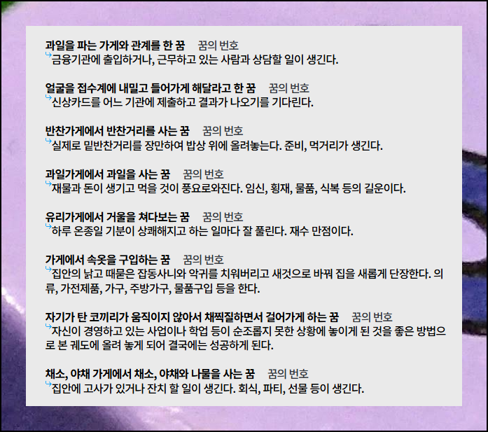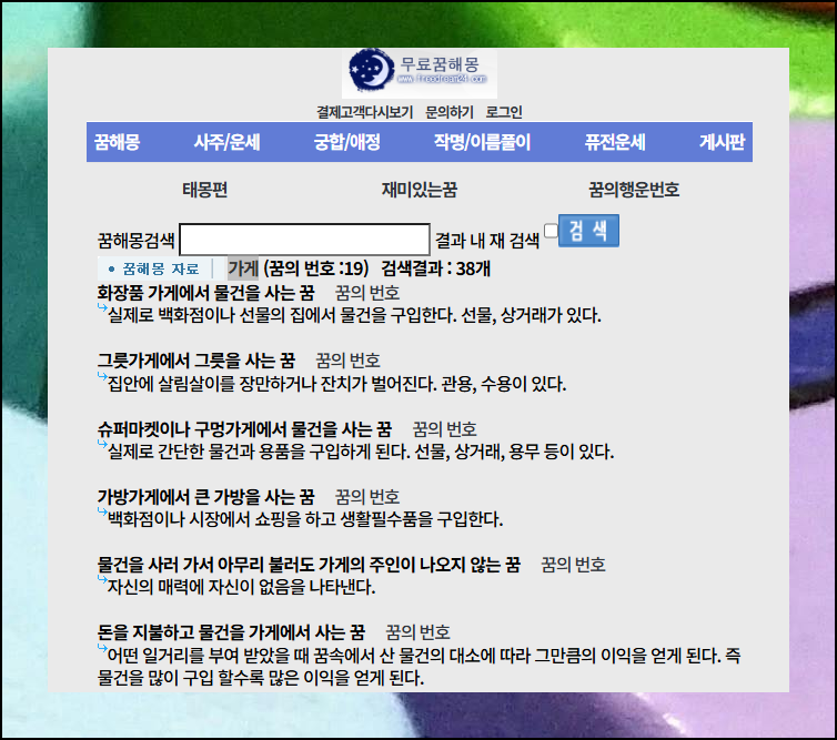가게와 연관된 여러 세부 상황도 확인할 수 있었어요. 화장품 가계에서 물건을 사는 꿈, 그릇가게에서 그릇을 사는 꿈 등 구체적인 내용들을 리스트로 볼 수 있습니다. 여기에서 선택하면 돼요.