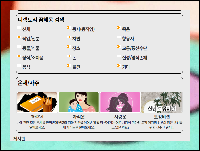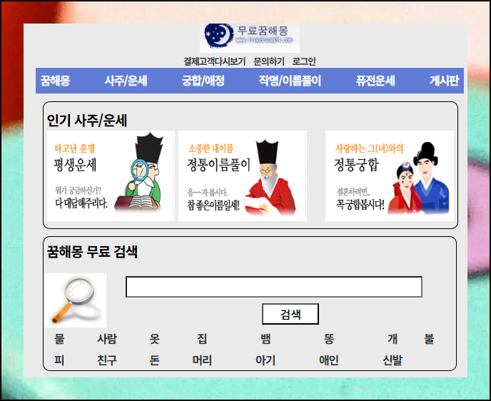 이 사이트는 해몽 말고도 흥미로운 운세 서비스가 많아요. 토정비결, 정통이름풀이, 정통궁합과 같은 전통적인 것부터 시작해서 자식운, 사랑운까지 다양한 역술 서비스를 제공합니다.