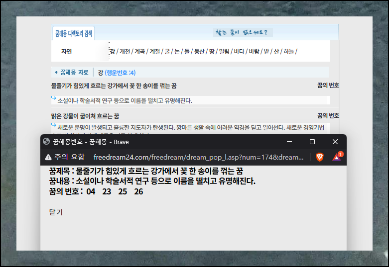 실제로 일부 당첨자들이 특별한 꿈을 꾼 후에 복권을 구매했다는 이야기도 종종 있는데요. 복권 당첨의 경우 운이 크게 영향을 주는 만큼 이러한 운세 서비스와 시너지 효과가 있다고 생각합니다. 무료 서비스이기 때문에 전혀 부담 없어요.