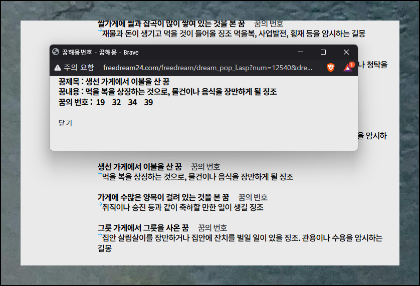 좀 더 자세한 분석을 원해서 "생선 가게에서 이불을 산 꿈"을 골라봤어요. 이에 대한 상세한 해석과 함께 로또에 사용할 번호로 19번, 32번, 34번, 39번을 추천 받았습니다. 이처럼 특정 꿈의 의미를 깊이 있게 분석한 내용을 무료로 받아볼 수 있어요.
