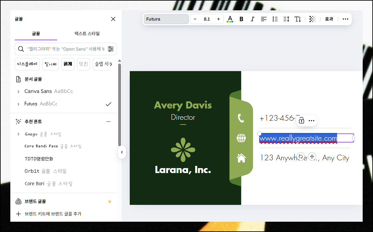 왼쪽에 나온 디자인 템플릿 중 하나를 골라보세요. 선택하자마자 오른쪽 미리보기 창에서 해당 디자인을 확인할 수 있어요. 이제 개인 로고를 넣거나 이름, 직책, 회사명, 웹주소, 메일 주소, 연락처 등을 입력하면 돼요.