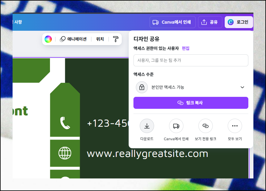 디자인 작업과 내용 편집이 끝나면 완성작을 이미지 파일로 받아보세요. 오른쪽의 다운로드 아이콘을 누르면 여러 형식으로 컴퓨터에 저장할 수 있어요.