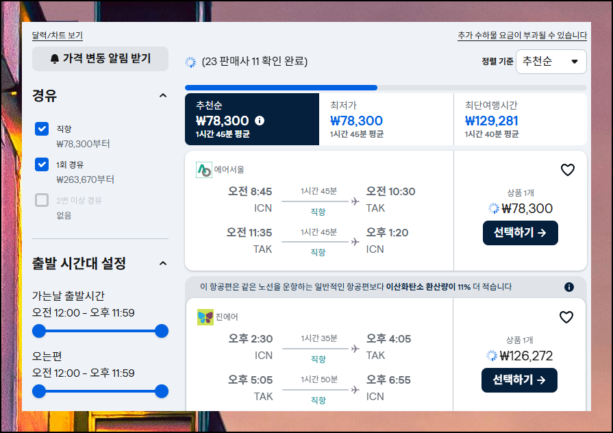 원하는 항공편을 클릭하면 예약 가능한 업체들의 정보가 나타나요. 일본행 비행기표 요금은 수시로 변동이 되기 때문에 알림 설정을 해두시는 걸 추천합니다. 현재 확인한 금액이 적절하다고 판단되면 즉시 예약 절차를 시작하셔도 좋아요.