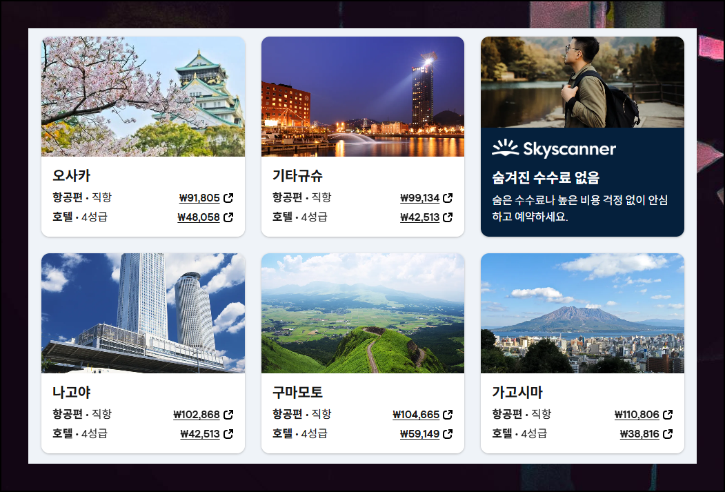 일본 전체로 검색해보면 다음과 같이 지역별 비행기표 가격을 서로 비교해볼 수 있어요. 아직 구체적인 여행지를 정하지 못한 분들한테는 정말 유용한 기능입니다.
