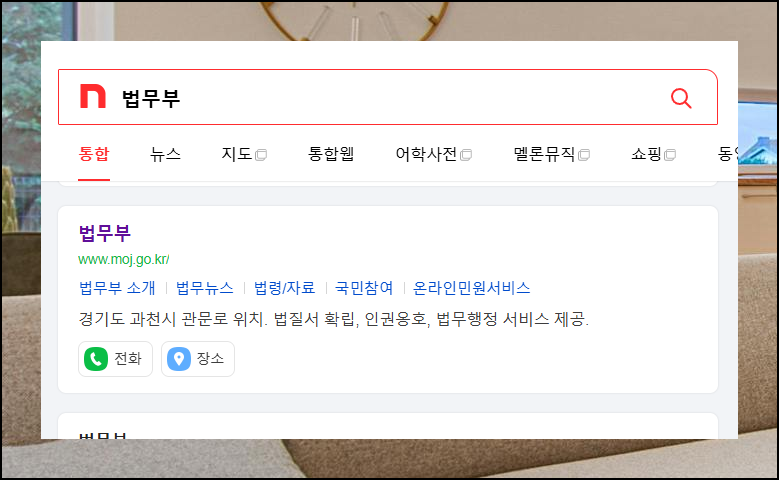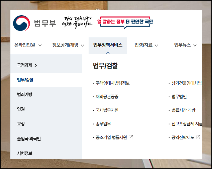 법무부 홈페이지 메인 화면에 도착하셨다면 이제 표준 계약서를 찾아볼께요. 법무정책서비스 섹션의 [법무검찰] 메뉴를 선택하면 됩니다.
