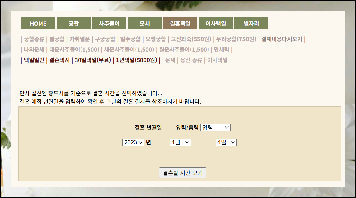 홈페이지 상단 메뉴에서 [결혼택일] 메뉴를 찾아서 클릭해보세요. 복잡한 절차 없이 바로 정보를 얻을 수 있습니다. 길일 확인하는 시간도 몇 분이면 충분해요.