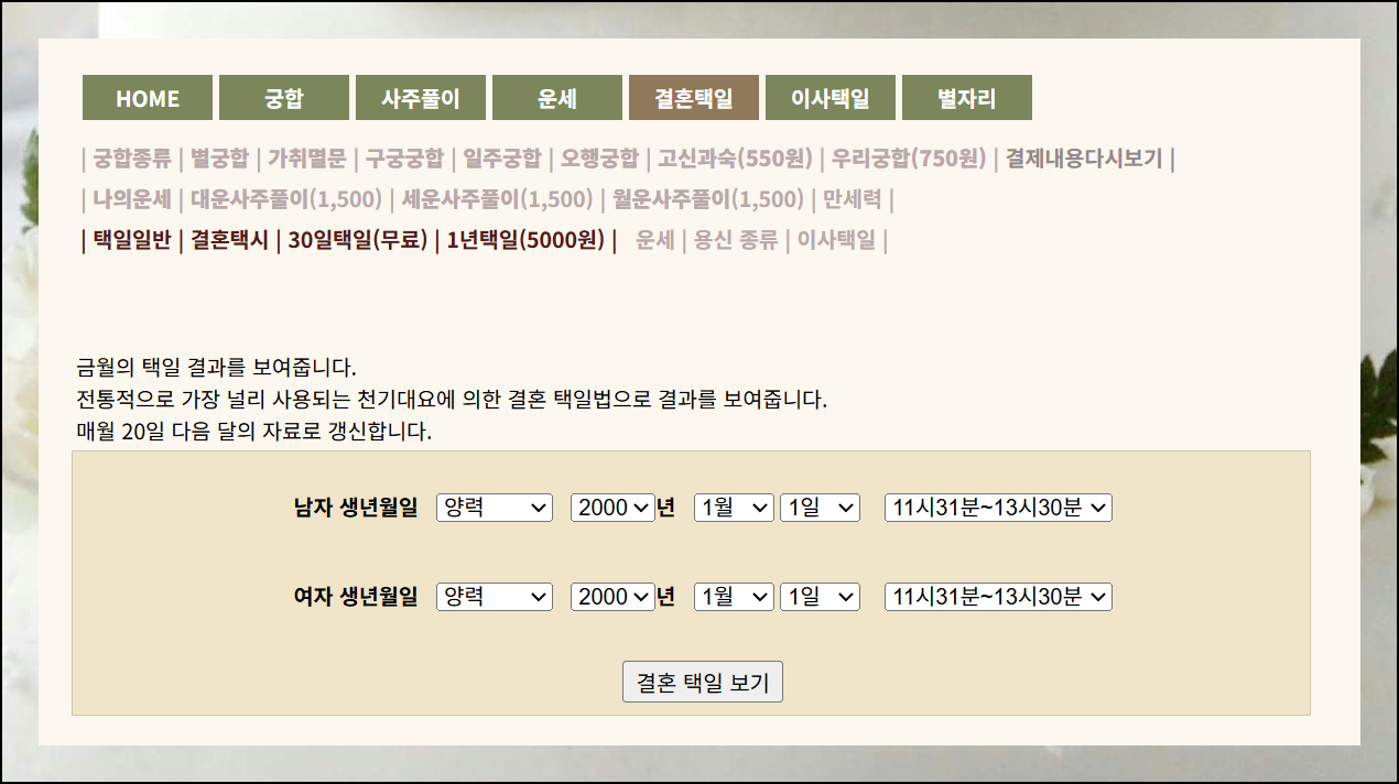 여기는 결혼 택일은 물론이고, 이사 시기, 두 사람 궁합, 운세까지 다양한 서비스를 제공하는 곳이에요. 몇 가지는 유료 서비스이지만, 우리가 원하는 2025년 결혼 택일 서비스는 공짜로 볼 수 있어요.